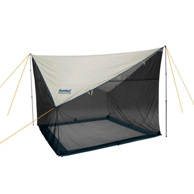 Ideal for canoe trips, group backpacking, car camping, picnics, and backyards, the lightweight and compact NoBugZone CT 13 screen shelter offers shade protection and a bug-free environment. The NoBugZone CT features full-length no-see-um mesh walls that keep insects out while still letting a cool breeze in. Simple to set up, the NoBugZone’s guy lines can be roped to surrounding trees or optional poles (sold separately). Integrated tie-back loops allow the mesh walls to be easily fastened back when using as shade/rain shelter, and internal gear rings provide an ideal clothesline tie-off. 3 zipper sliders on each door makes for easy use with a hammock when tied off to trees, and 3 reinforced tarp tie offs on each edge allow for extra stability anywhere. Measures 9 feet square (275 cm) with a center peak height of 7 feet, 4 inches (224 cm); diameter of 12 feet, 8 inches (386 cm); packs down to 7 x 19 inches (18 x 48 cm); weighs 5 pounds, 14 ounces (2.66 kg). Eureka! found its humble beginnings in 1895 and today their camping gear gives you the freedom to have fun – from tents to cooking systems, and sleeping bags to camp furniture – reliable, easy-to-use, and packed with features campers care about. With Eureka!, you don’t have to sweat the small stuff and can enjoy the freedom to have a good time with friends and family. Because you go for the fun of it. Floor Size 9 ft x 9 ft | Interior Peak Height 7 ft 4 in | Minimum Weight 5 lbs 14 oz | Pack Size 7 in x 19 in | Doors 2 | Roof Fabric 75D 190T polyester taffeta 1500 mm | Mesh 40D polyester no-see-um | Stake Material Steel | Color Silver Birch, Legion Blue, Cadmium |