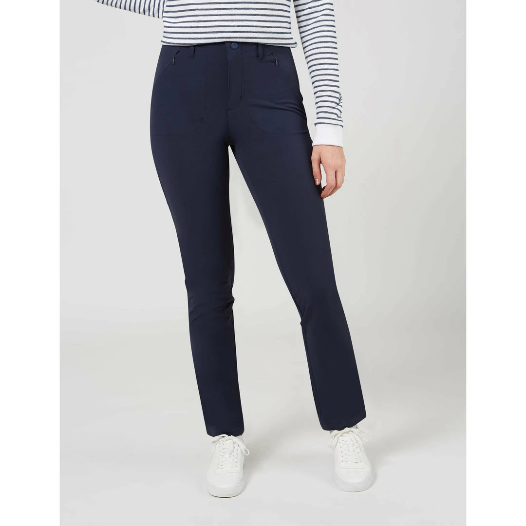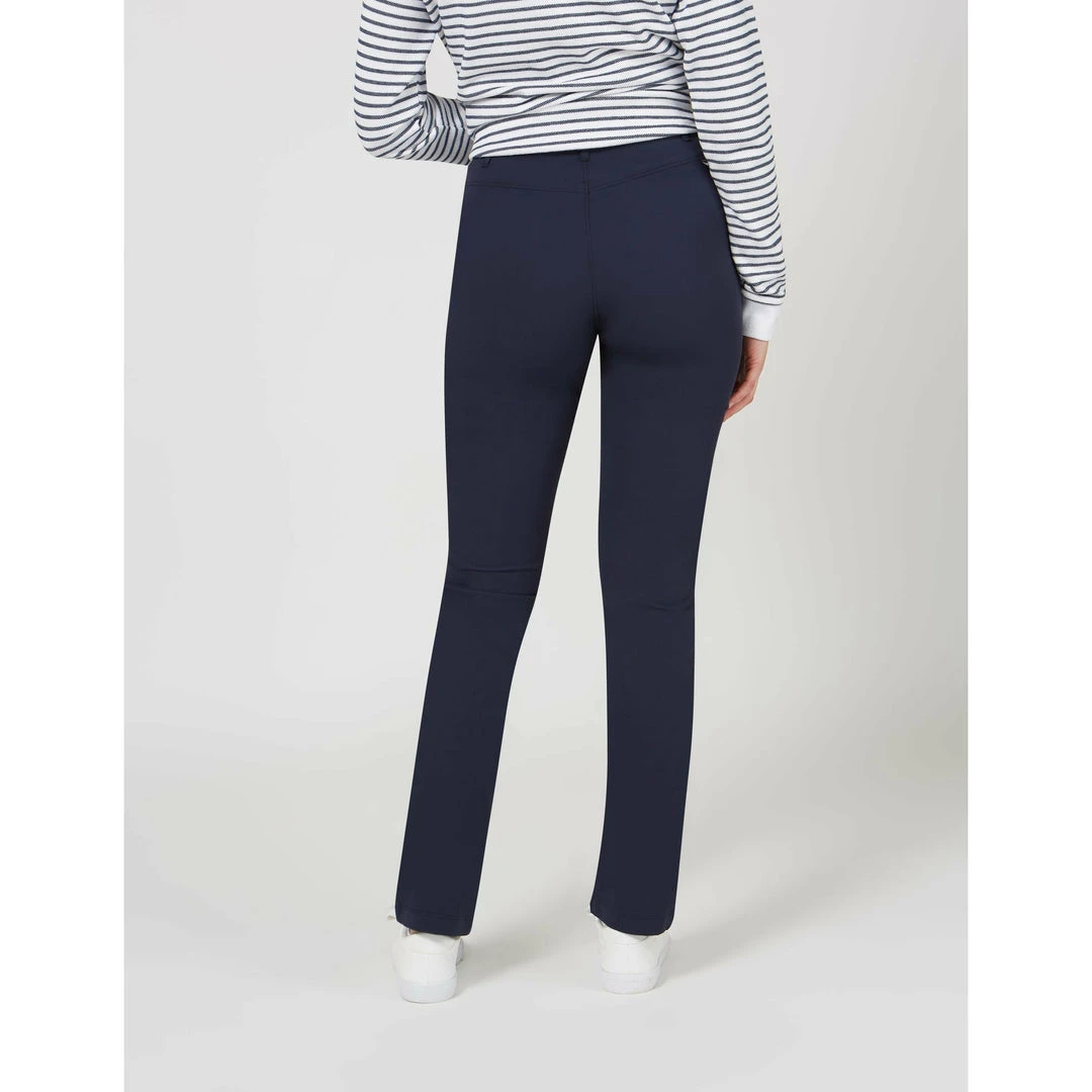 Bluesign® approved mid-rise pants with hidden elastic at waistband, flattering profile waistband, snap button and hidden hook and eye at front zip fly, two slant pockets at front with YKK® zipper, and loops at waistband.