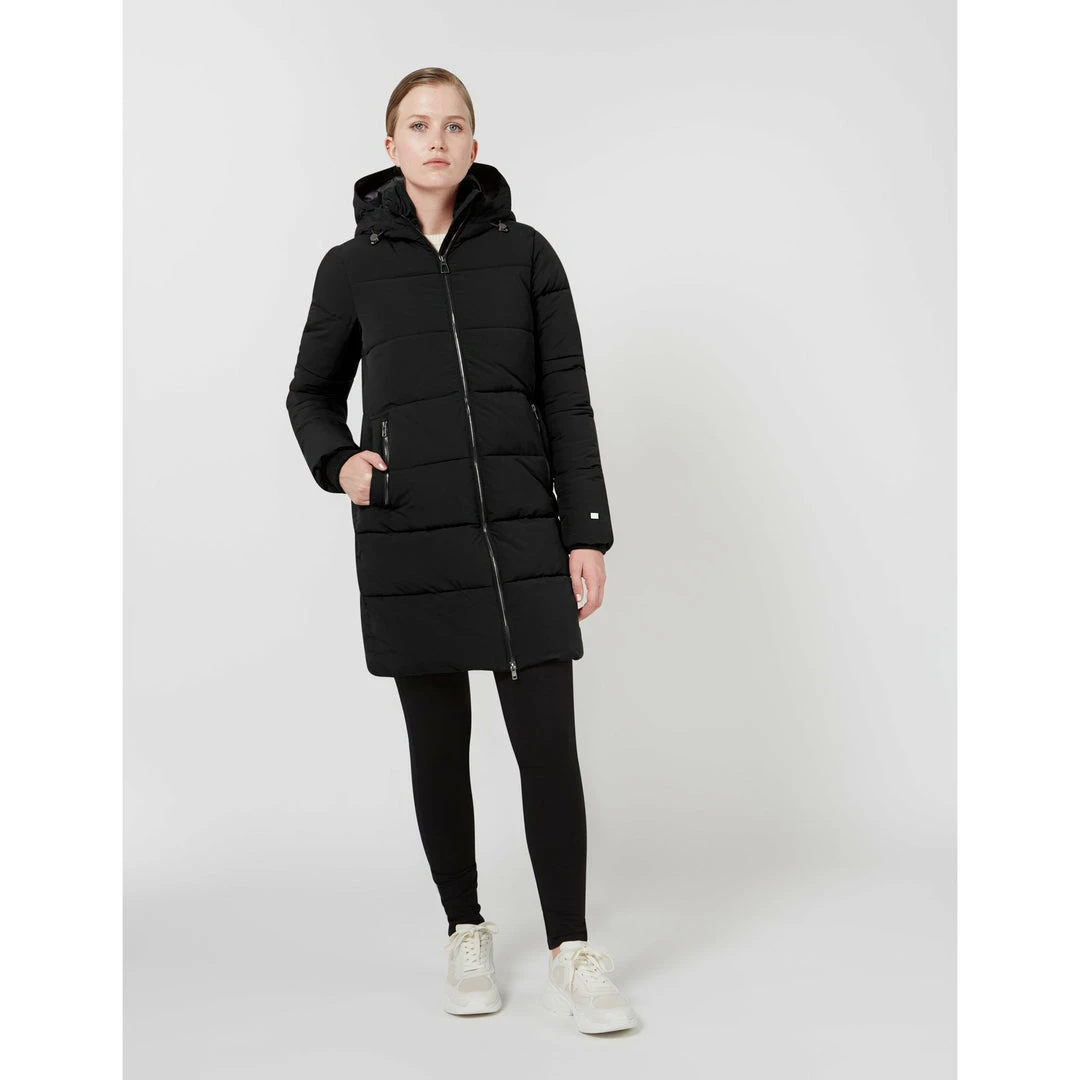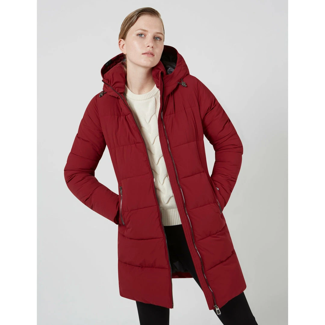 Winter parka with adjustable insulated hood with exterior drawcords made with Repreve® certified recycled polyester, which is made from post-consumer plastic bottles, and with Sorona®, which is made from plant-based materials. Jacket with two way METALUXE® YKK® zipper at center front, fleece lined handwarmer pockets with METALUXE® YKK® zippers, fleece lined inset handwarmer pockets with snap closure, inner stretch suspender, zip secure inner passport pocket, inside back waist adjustment, and inner cuffs in quilt stitch rib.