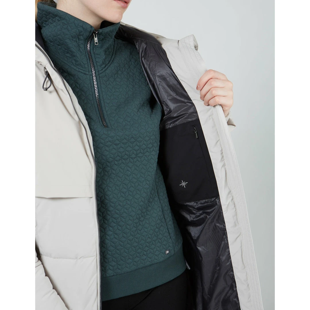 Winter parka with adjustable insulated snorkel hood with exterior drawcords made with Repreve® certified recycled polyester, which is made from post-consumer plastic bottles, and with Sorona®, which is made from plant-based materials. Jacket with two way METALUXE® YKK® zipper at center front, fleece lined handwarmer pockets with METALUXE® YKK® zippers, fleece lined inset handwarmer pockets with snap closure, inner stretch suspender, zip secure inner passport pocket, inside back waist adjustment, and inner cuffs in quilt stitch rib.