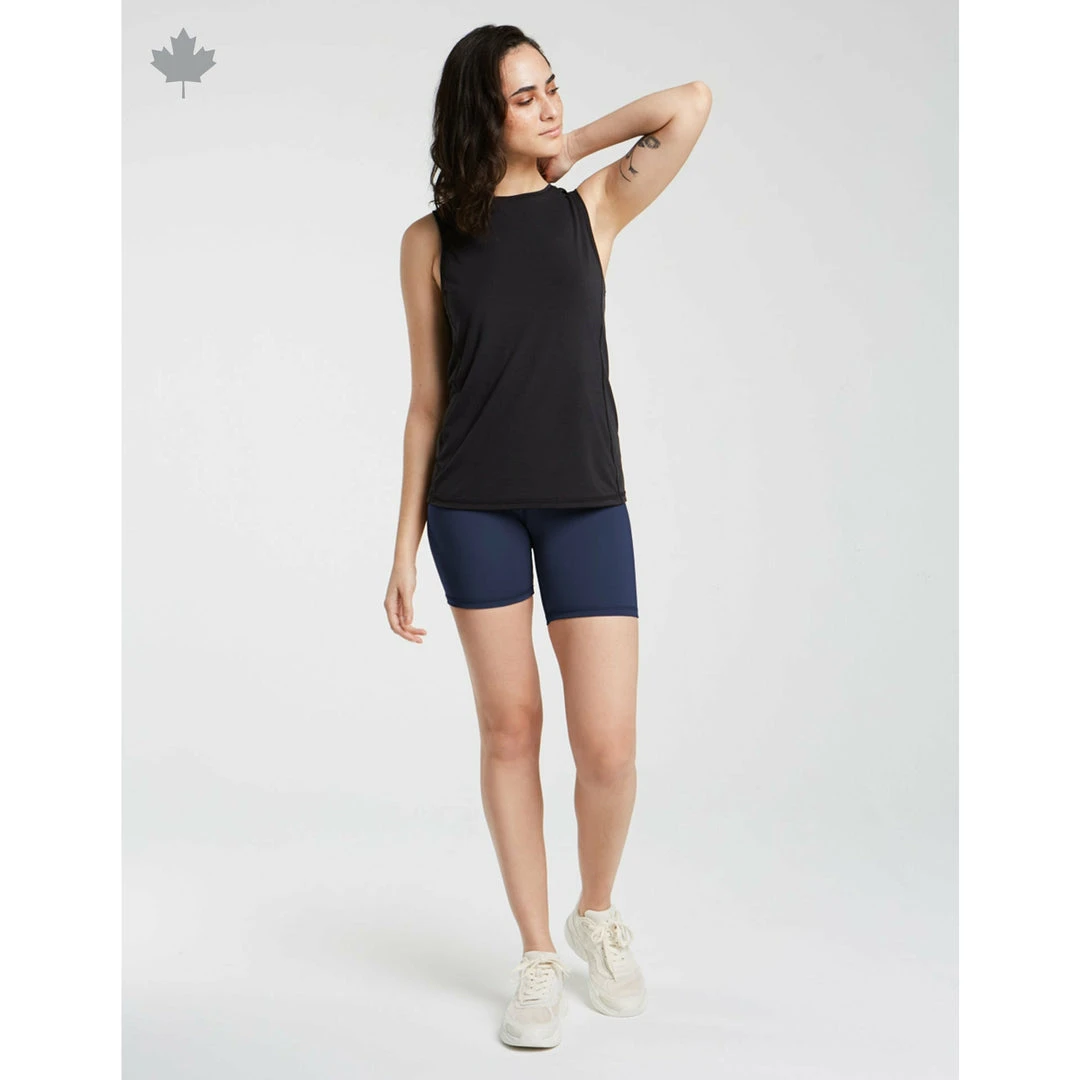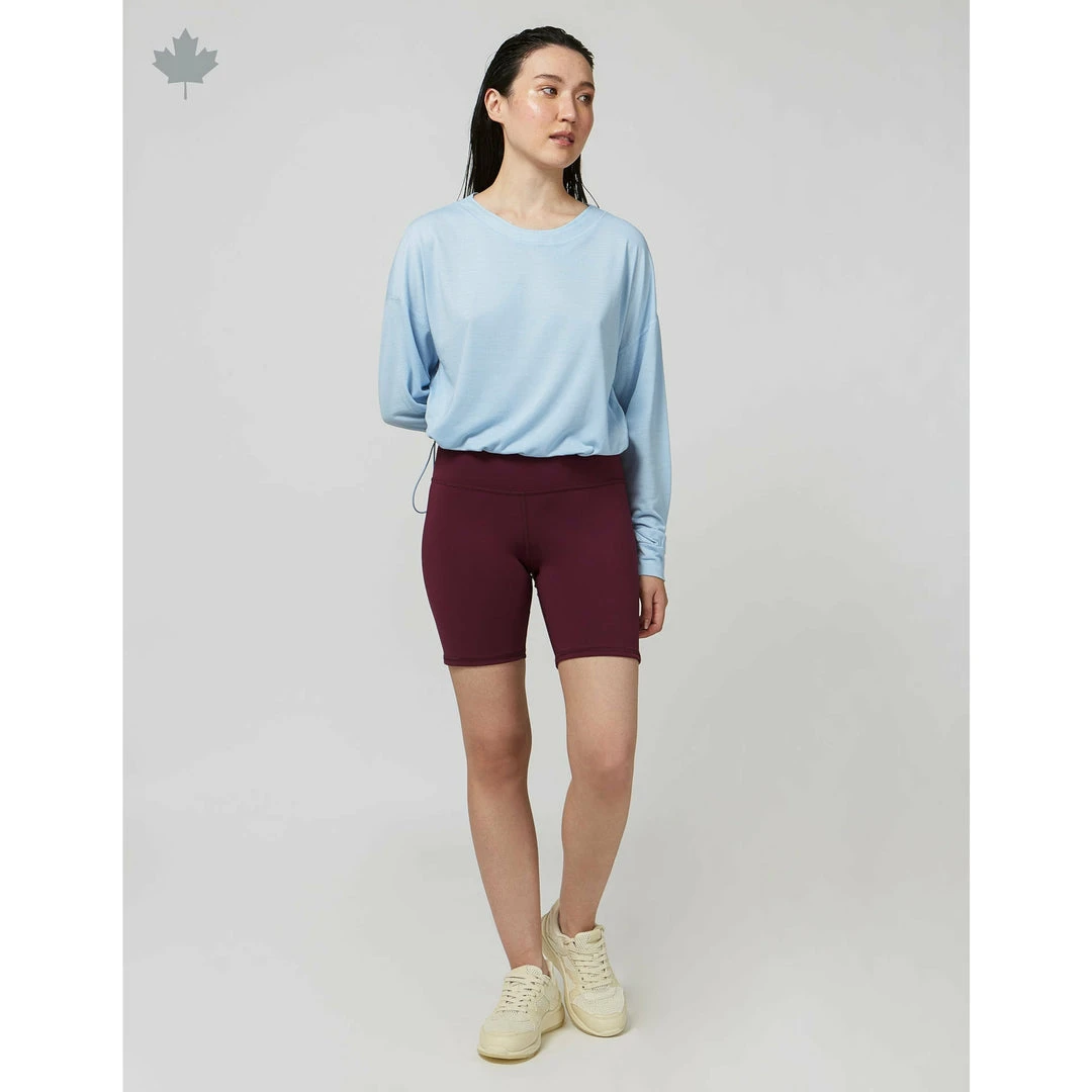 Stretch bike short made with Möbius Flex™, which is made with recycled polyester, created by using post-consumer plastic bottles. High-rise ultra opaque bike shorts with built-in gusset, hidden pocket in the waistband, and comfortable and compressive waistband.