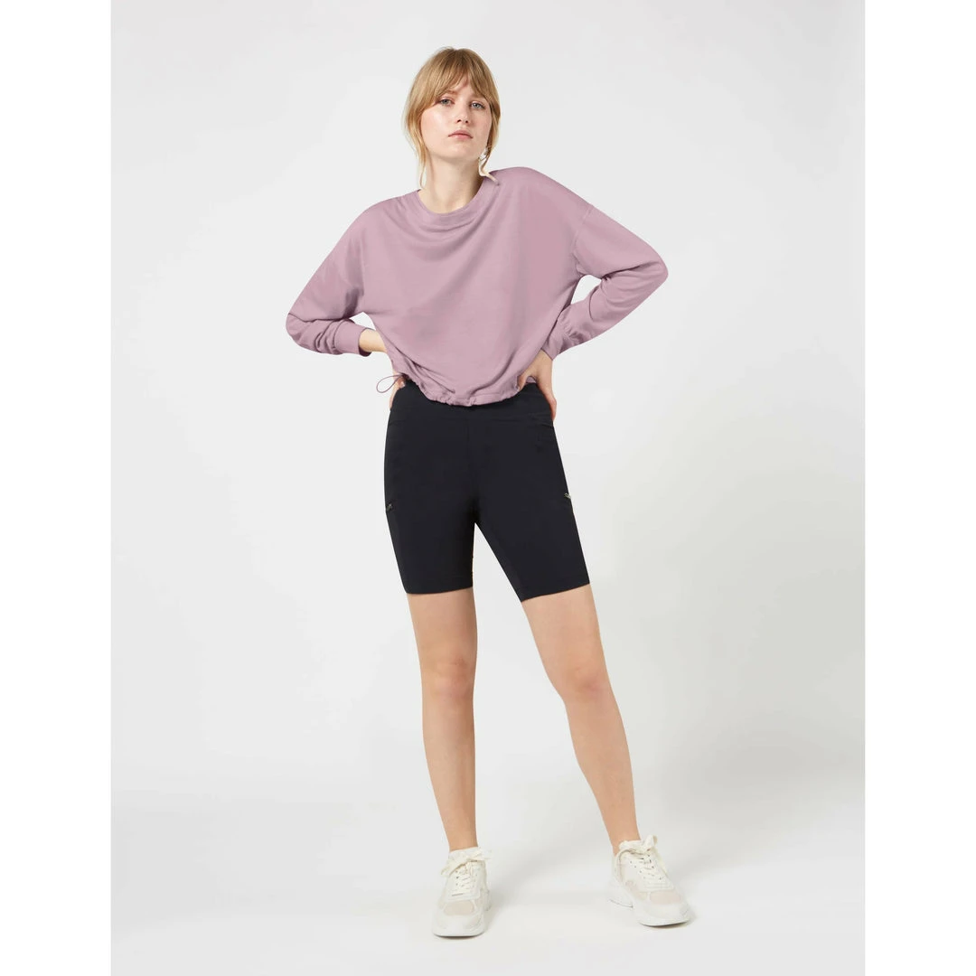 Long sleeve top with round neckline made with Air Light, which is made with recycled polyester, created by using post-consumer plastic bottles. Top with V-neck at back, dropped shoulder sleeves, drawcord at waist, and woven fabric combo at hem and collar.