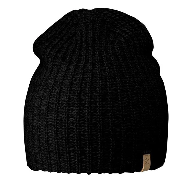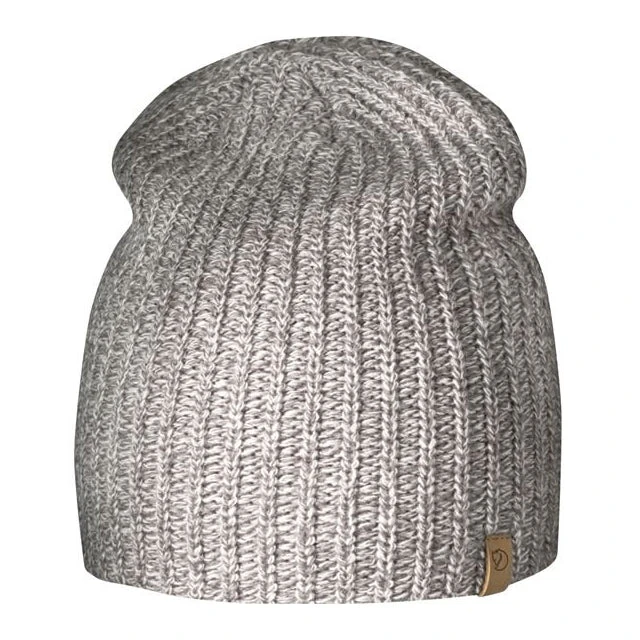 Comfortable rib knitted hat in soft acrylic. Double yarn gives it a marbled look. Small folded leather logo on the side.