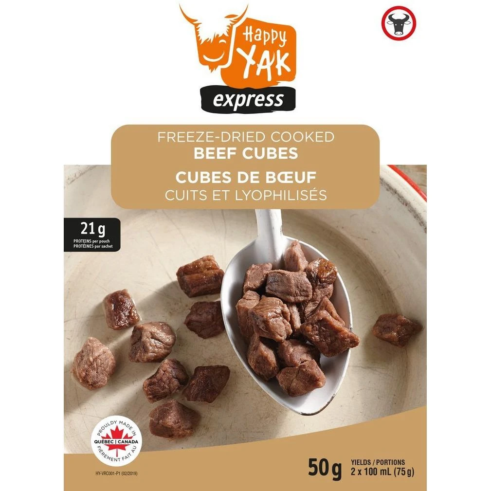 - Ingredients: Freeze-dried cooked beef cubes (beef, beef broth, onion flakes).