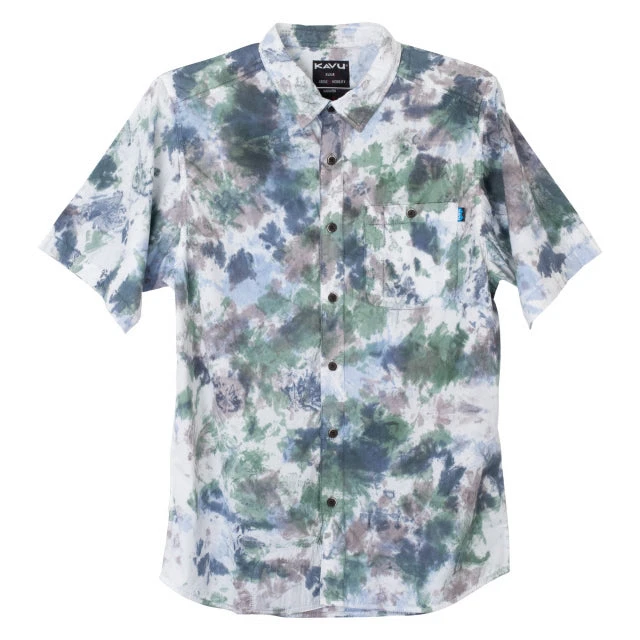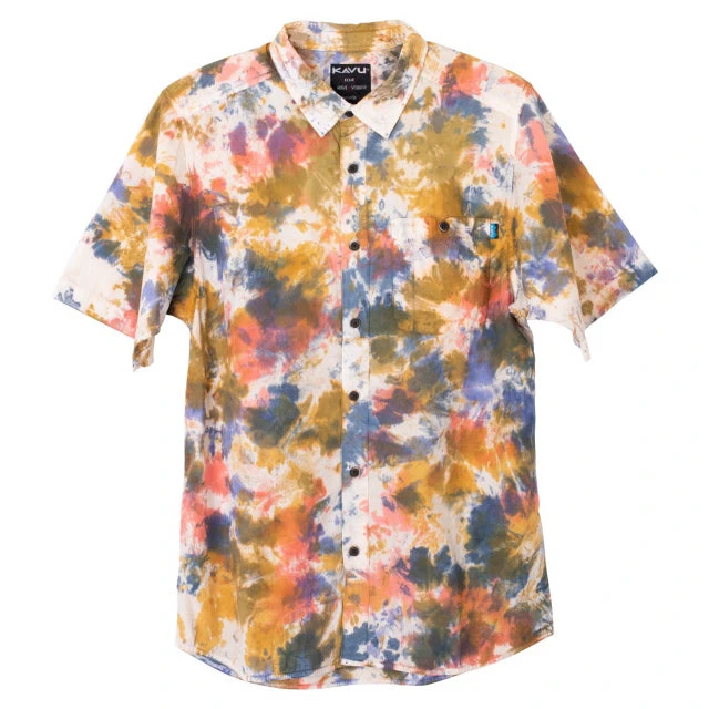 At KAVU we celebrate the independent spirit. The Excellent Adventure is this spirit in garment form. Sure, this handsome devil is made with 100% cotton poplin weave and 25% certified recycled polyester faux wood buttons, but every single shirt is hand tie-dyed. This means no two pieces are the same and your Excellent Adventure will be just as unique as you. Casual fit, short sleeve button up hand tie dyed shirt, stand collar with self-fabric neck tape, single chest pocket with pen pocket, 25% certified recycled polyester faux wood buttons, back yoke panel with center back box pleat, curved hem.