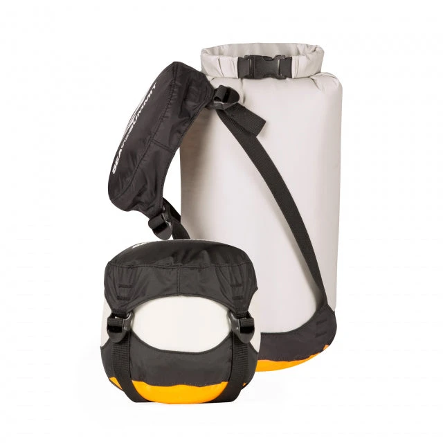 Made from a sturdy 70D Nylon waterproof fabric in the body and lid, with an eVent waterproof but air-permeable base that allows air to be pushed out of the sack. No need for a purge valve, making these lighter and simpler. The four compression straps, use hypalon roll-top non-wicking closure. These dry sacks are the epitome of durability, versatility, and compression.
