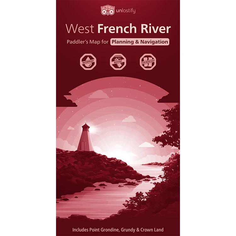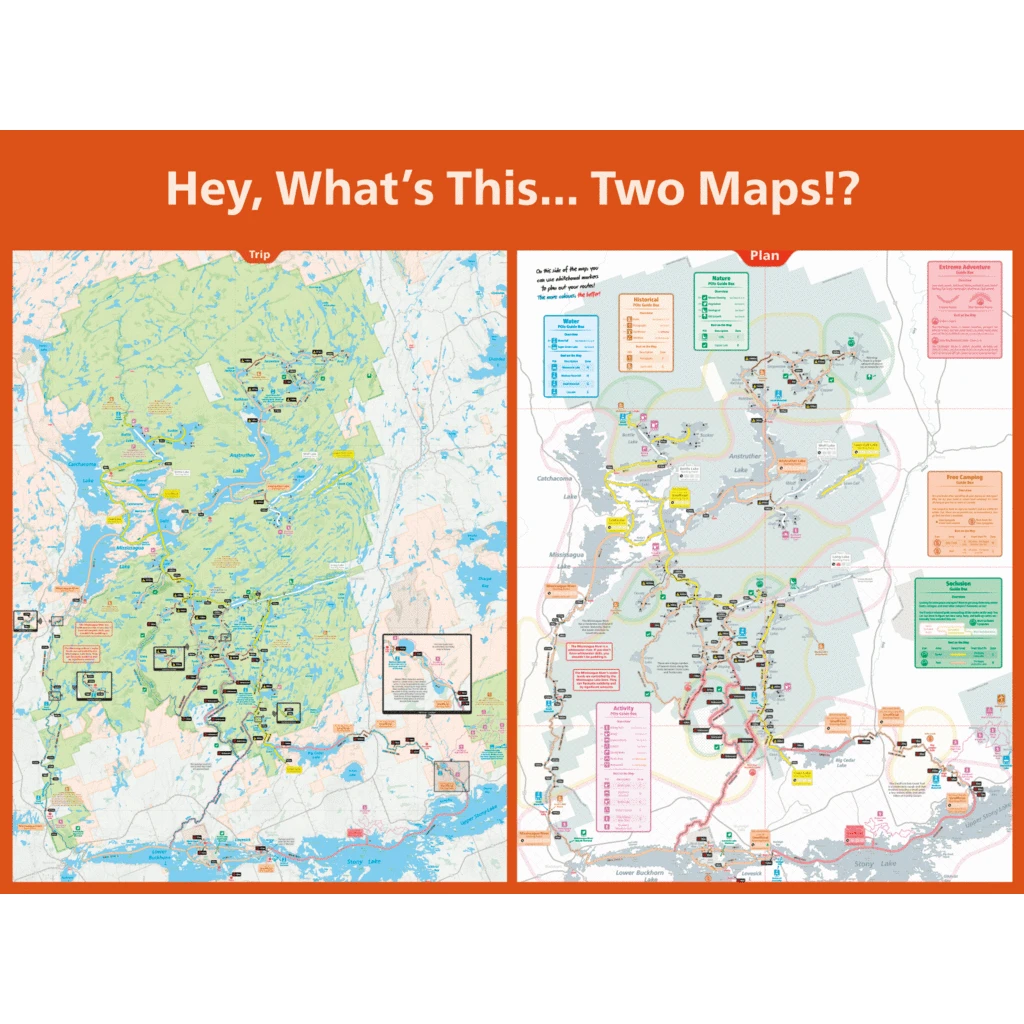 Unlostify maps provide users the benefit of a double-sided map – one for planning and the other for the trip itself. With glow-in-the-dusk ink and colour-coded routes, this map of the Kawartha Highlands is easy to read and helpful for all paddling skill levels.