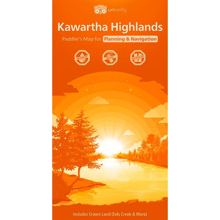 Unlostify maps provide users the benefit of a double-sided map – one for planning and the other for the trip itself. With glow-in-the-dusk ink and colour-coded routes, this map of the Kawartha Highlands is easy to read and helpful for all paddling skill levels.